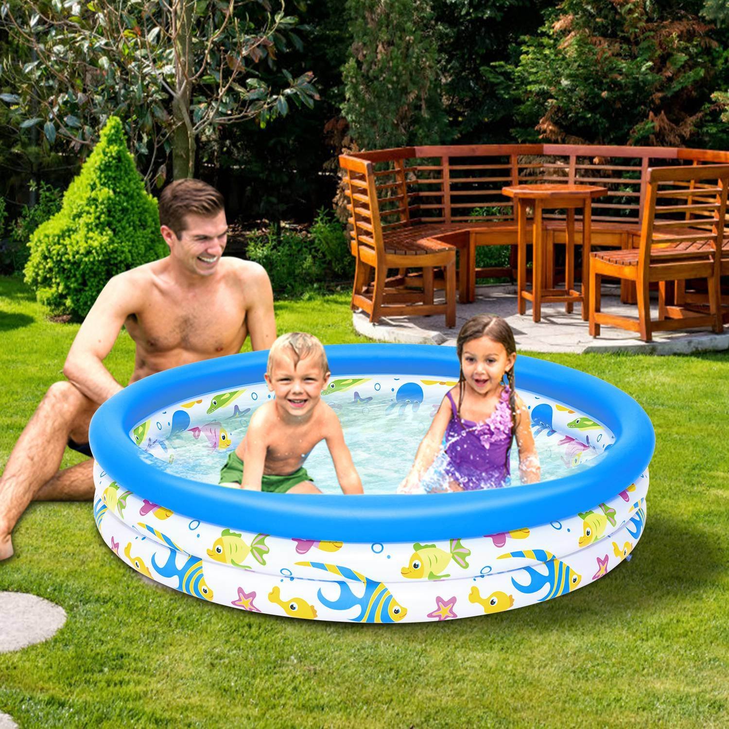 **HAPPY KIDS TOGETHER*:48x48x10' Inflatable size is recommended 2 kids to enjoy splashing pool party in the backyard. Printed pattern of fish will definitely inspire children’s storytelling and creativity skills on a hot day.
