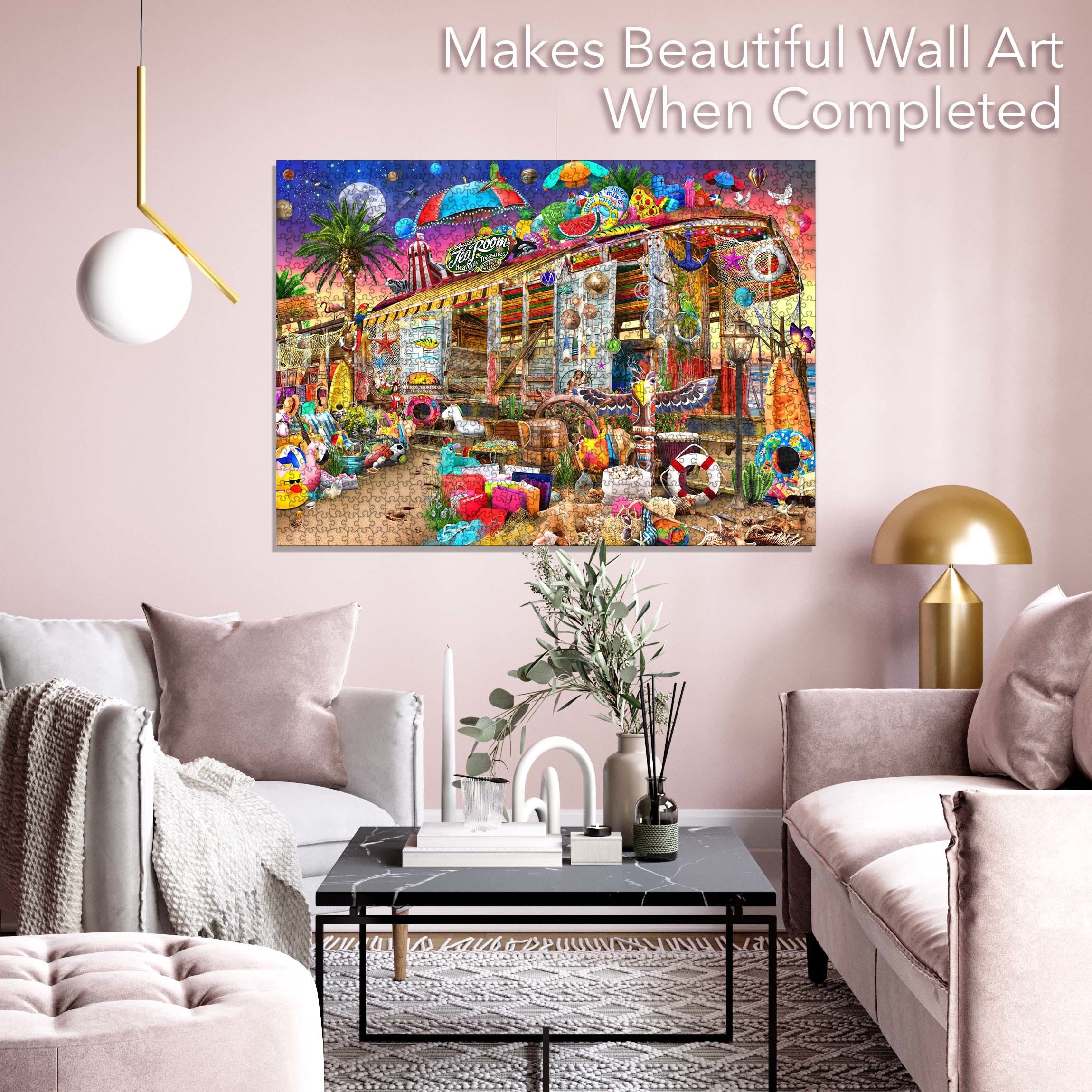 Beach fantasy art in our puzzle has a view of a scenic beach at sunset with many details in every cornor of the puzzle like many beach gears and beautiful view of the night sky also.1000 Piece Jigsaw Puzzle with a perfect blend of elegance and creativityEach & every piece is unique in shape (Random Cut) to make the jigsaw puzzle-solving experience memorablePearl Series puzzles are premium quality puzzle which is made from Japanese high quality board.Each puzzle piece is around 2mm thick which makes the puzzles durable and sturdyThis 1000 pieces jigsaw puzzle contain add-ons likepuzzle poster; zipper bagand; puzzle box stand.High-qualityPearl Seriesboards are used to give the puzzle a premium look and feelDroplet Technologyis used in all our puzzles to achieve anti-glare surface; premium matte effect; and micro water drop effect.100% refund; if you don't feel satisfied with the quality of the product.Made With Love For America.
