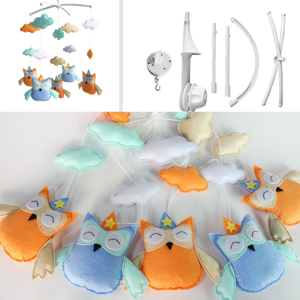 Blue Orange Flying Owls and Clouds Handmade Baby Crib Mobile Boys Girls Musical Mobile Infant Nursery Hanging Toy Blue Orange Flying Owls and Clouds Handmade Baby Crib Mobile Boys Girls Musical Mobile Infant Nursery Hanging Toy