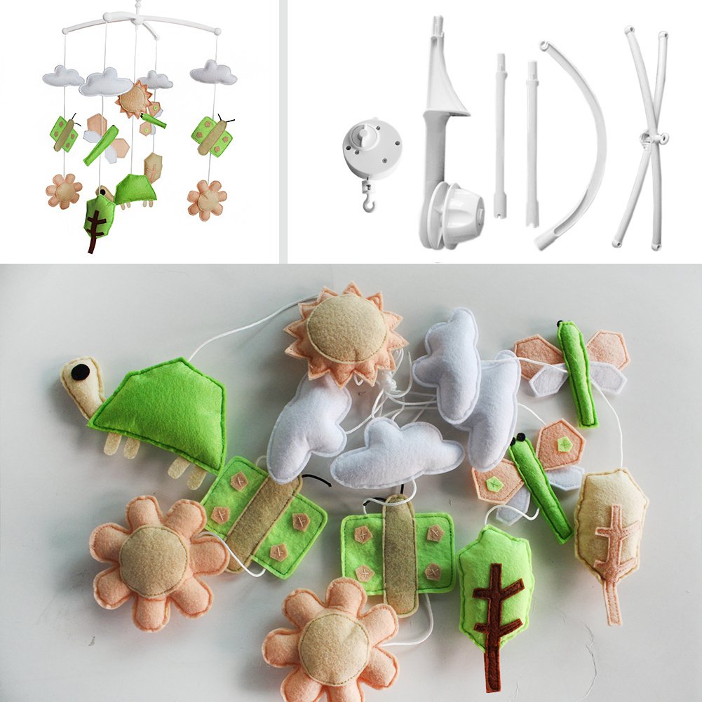 This handmade baby crib mobile plays light music to help your baby easily fall asleep. Easy operation and convenient to use; it will rotate while playing music. Each bed bell plays Only One soothing pure and light song. Keep baby calm and happy. It is an essential product for baby and nursery. Perfect for baby shower or mom-to-be gift for baby's nursery. Baby's nursery room decoration. The toys are made from nonwoven fabric.