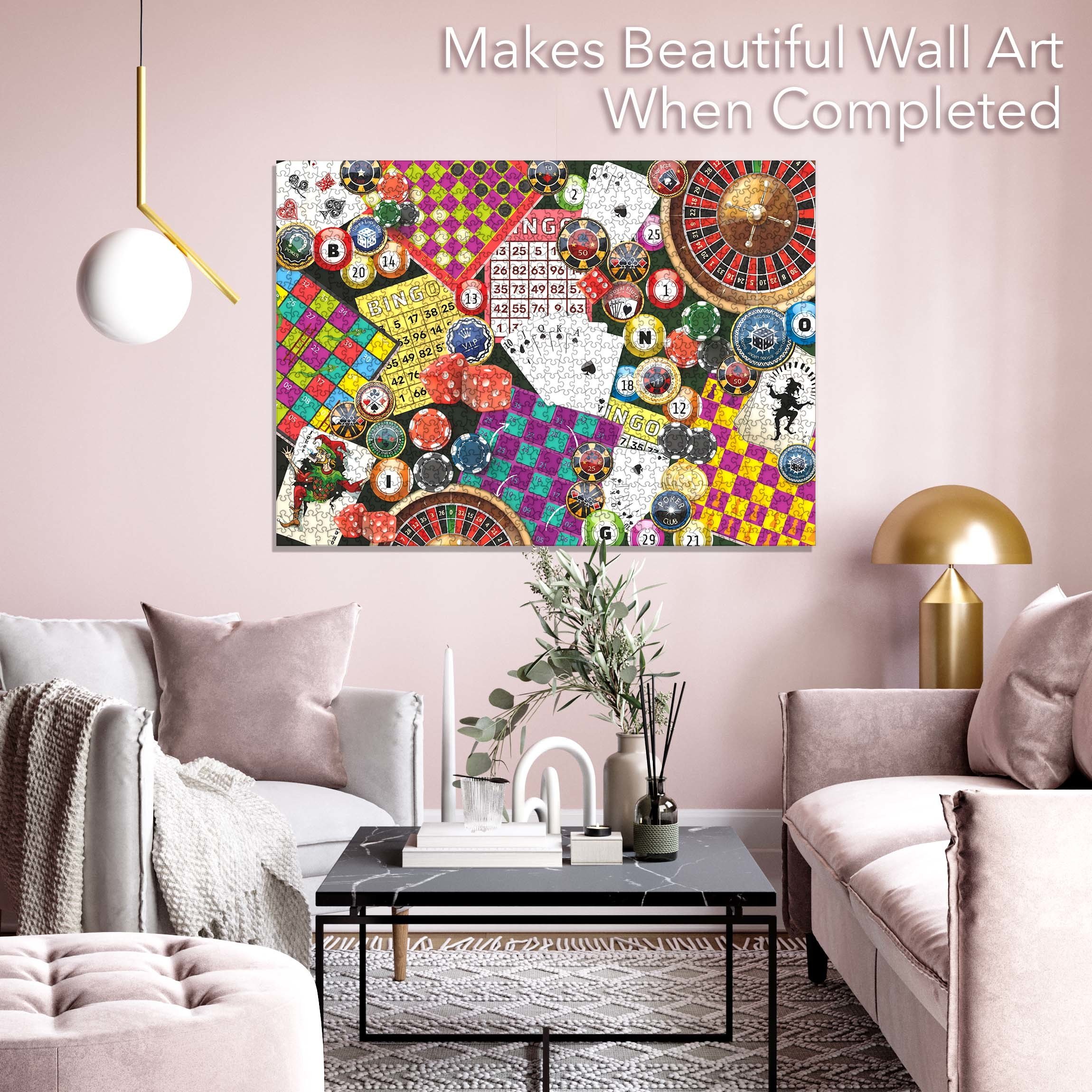 Casino puzzle art is a collage art of a casino table with many games that you could find in a casino . This art has a jumble of colorful games which makes the solving swift and engaging.1000 Piece Jigsaw Puzzle with a perfect blend of elegance and creativityEach & every piece is unique in shape (Random Cut) to make the jigsaw puzzle-solving experience memorablePearl Series puzzles are premium quality puzzle which is made from Japanese high quality board.Each puzzle piece is around 2mm thick which makes the puzzles durable and sturdyThis 1000 pieces jigsaw puzzle contain add-ons likepuzzle poster; zipper bagand; puzzle box stand.High-qualityPearl Seriesboards are used to give the puzzle a premium look and feelDroplet Technologyis used in all our puzzles to achieve anti-glare surface; premium matte effect; and micro water drop effect.100% refund; if you don't feel satisfied with the quality of the product.Made With Love For America.