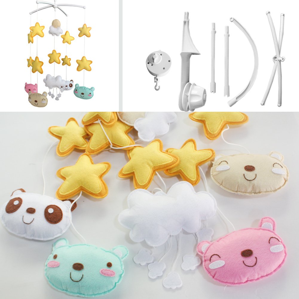 This handmade baby crib mobile plays light music to help your baby easily fall asleep. Easy operation and convenient to use; it will rotate while playing music. Each bed bell plays Only One soothing pure and light song. Keep baby calm and happy. It is an essential product for baby and nursery. Perfect for baby shower or mom-to-be gift for baby's nursery. Baby's nursery room decoration. The toys are made from nonwoven fabric.