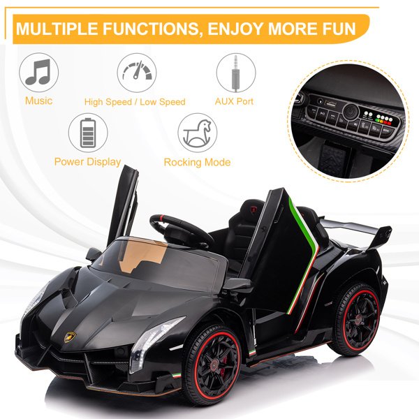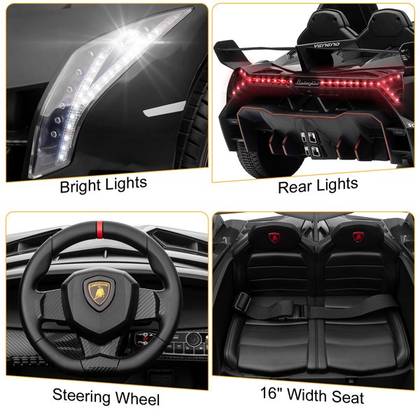 Manufactured under official license from Lamborghini. Astm-certified. The licensed Lamborghini Veneno comes with bright headlights and realistic taillights. Looks like the real model. With high quality material. Parents can let their child drive manually or use the remote control to safely guide them when necessary. Your children will feel like they are driving a real car with powerful rear motors. It is safe and durable enough for your child to play. Adjustable seat belt for safe and comfortable use. This toy will be your best choice!