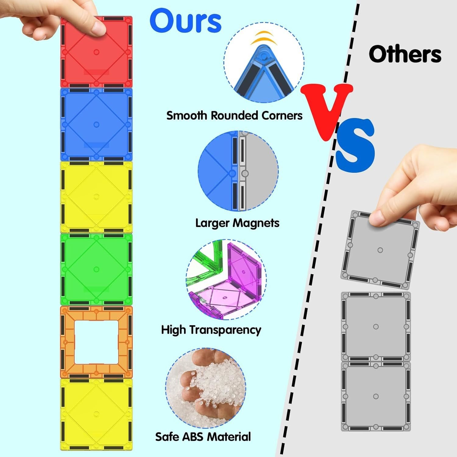 Larger magnetic tiles set, 102PCS in total(all basic shapes and colors, no cars)with an idea book. compatible with most of the magnetic building tiles on the market.The magnet tiles set is made of high quality ABS plastic, BPA-FREE, NO LEAD, ASTM-approved. Stronger magnets sealed within the plastic frame, easy to build sturdy castles. safe for your kids to playHigh transparence. Bright colors, rainbow shadow will show up when the lligh shine through the magnetic tiles. Round edges, safe to play,not easy to scratch.Keep your kids focused, away from video games,Happy family hour with your kids,enhance your relationship with your kids. help to learn color matching and color recognition,construction skills, sorting Skills, stacking SkillsCustomer first. We aim to provide flawless products and perfect customer service. If there is any quality problem, please don't worry,we will replace it or refund you.