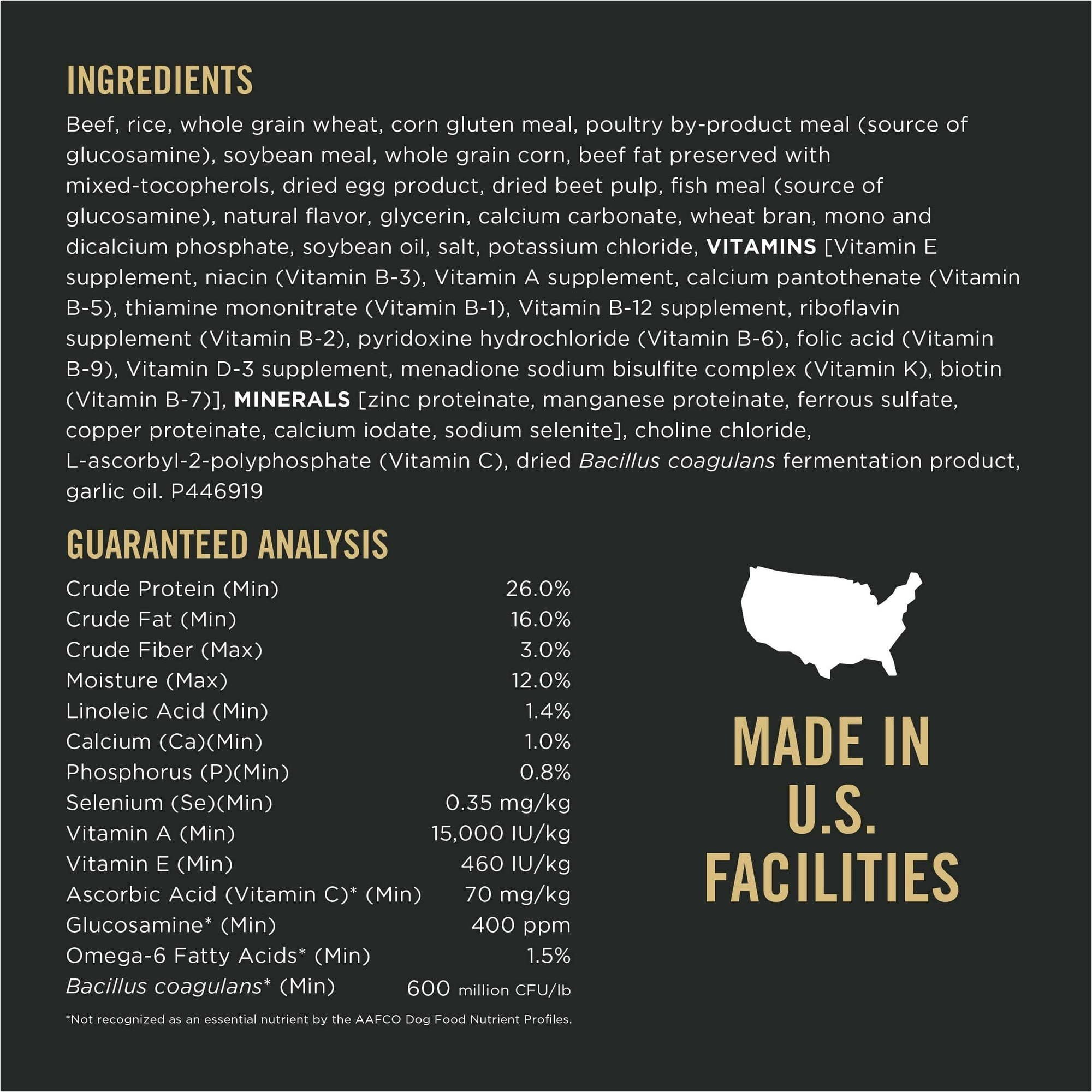 Purina Pro Plan Complete Essentials for Adult Dogs Beef Rice, Balance nutrition and taste when you feed your dog Purina Pro Plan Brand Dog Food Shredded Blend Beef Rice Formula adult dry dog food. Guaranteed live probiotics support digestive and immune health, and with real beef as the first ingredient and rice, this high-protein dog food doesn't compromise on nutrition or flavor, making mealtimes an experience your dog can't forget. This tasty formula combines hard dog food kibble with tender shredded bites for a unique texture dogs love.