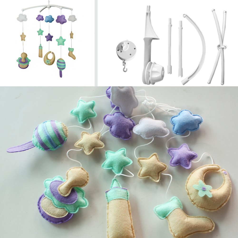 3.Each package contains a baby crib mobile holder arm bracket, a Wind-up Music Box and hanging non-woven fabric toys.