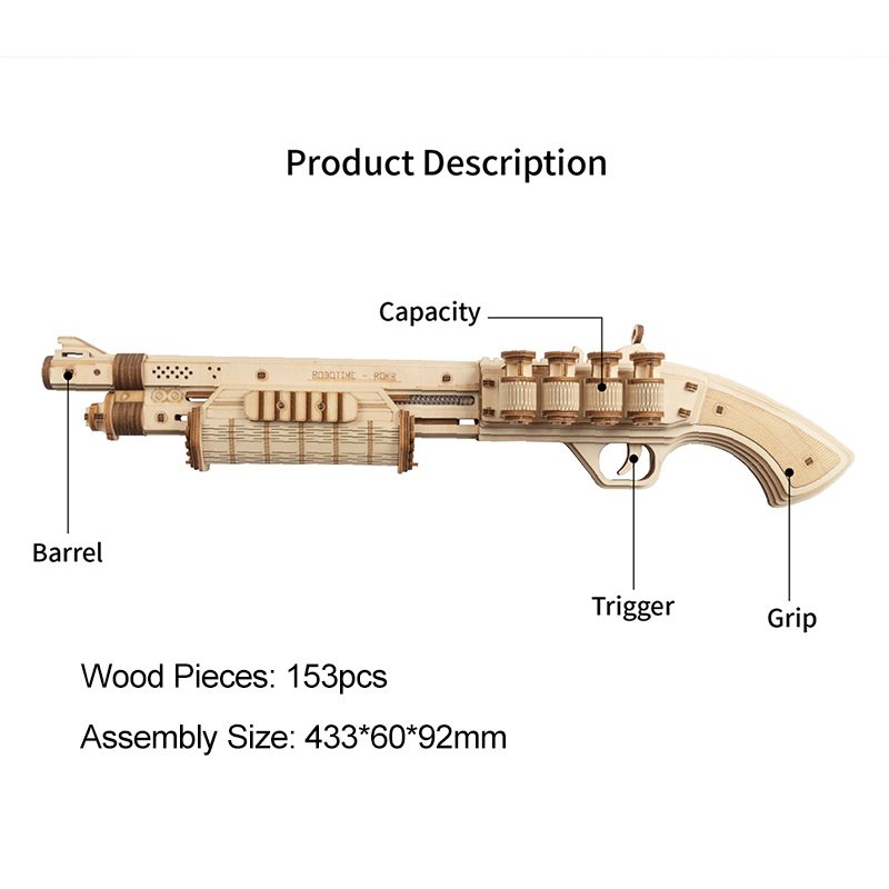 1.1. Gun Mechanism----Mechanical Wooden 3D Model-shotgun construction set with real-action release and safer rubber band bullets,6 shots a round.Pull the trigger and return to the wild old west time!5 Wooden Villains as targets-Simulate real game training.