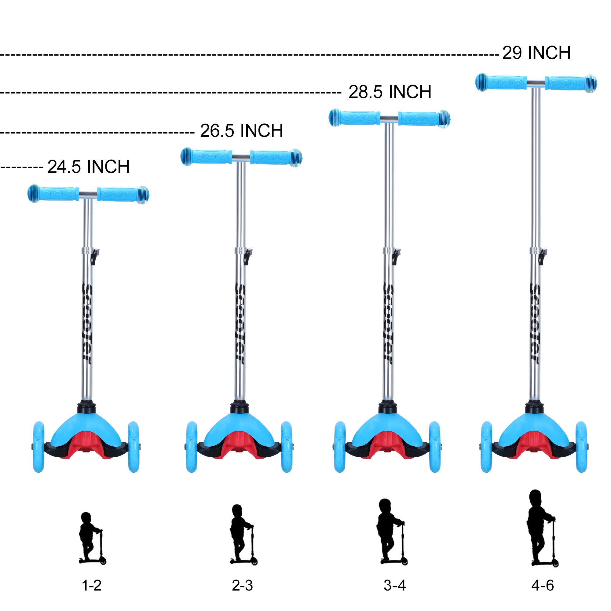 [Adjustable Handlebar] The kick scooter equipped with an adjustable handlebar, T-bar with Secure Lifting and Twisting Lock can be adjusted from 24.5 to 29 inches from the ground to accommodate children as they grow.