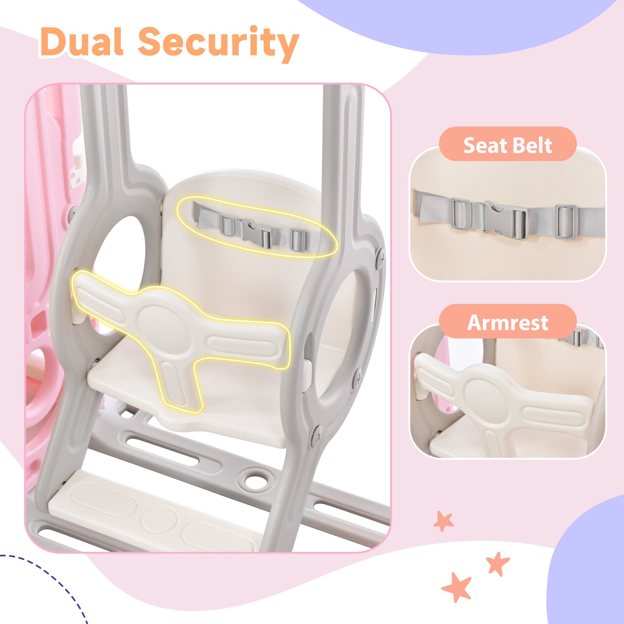 [Children's Playground 5-in1] Refreshing styling design! Delicate and cute freestanding swing and slide set for toddlers with three functional parts: 1 slide; 1 climbing ramp; 1 swing; 1 basketball hoop; and 1 hidden space for toy storage. This set allows children to completely release their playful nature; and they can play with their friends for hours!